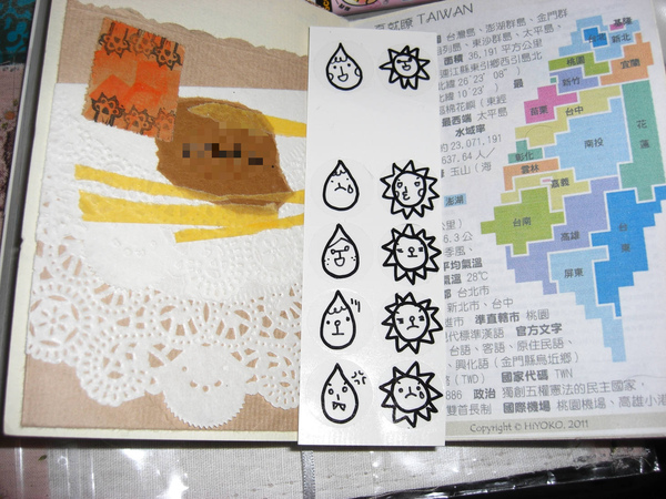 這頁是版友們的愛心,之前有跟兩位版友索取小圓貼(sakurainei、gheosy),其中左手邊有蕾絲的部份,是sakurainei版友的包裝,但我捨不得丟掉,封住三邊,作為簡單的收納袋。右手邊則是agnesc05的一頁就瞭台灣,印起來字體大小剛好,顏色也都設計得非常漂亮,非常謝謝您無私的分享:)