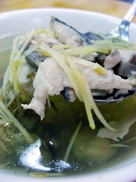 魚湯內因為有薑絲,喝起來帶點微辛微嗆,在吃完蒜肉飯、肉燥飯後