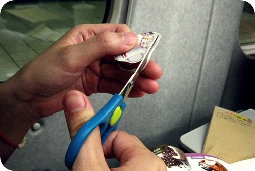 由於設定旅遊紀錄要當天紀錄,所以帶的器具有剪刀、分裝的紙膠帶、口紅膠、花邊帶以及貼紙不等,Luke前一晚看我收拾時,他笑說:請問是打算要環遊全世界嗎?!我說:寫時方知用具少,常使東藏淚滿襟,所以別的東西可以少帶,文具這種萬萬不可少!!而這次使用的剪刀,購於大潤發,使用起來覺得挺銳利的,顏色可愛,中間是愛心造型,往下推,則可以鎖住剪刀,這點是Luke發現,我以為愛心只是裝飾...價格隱約是10幾塊吧,十分可愛的價錢。