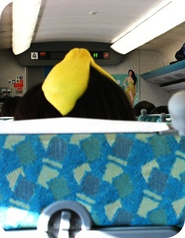 在我奮力寫著手帳時,Luke發現在我們前方附近,有個乘客帶著柚子帽,持續的時間相當長,下車的乘客們,往往會小小注目一下,又趕快把眼神飄走,我們想可能是大冒險輸了吧?!